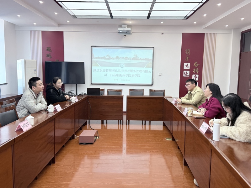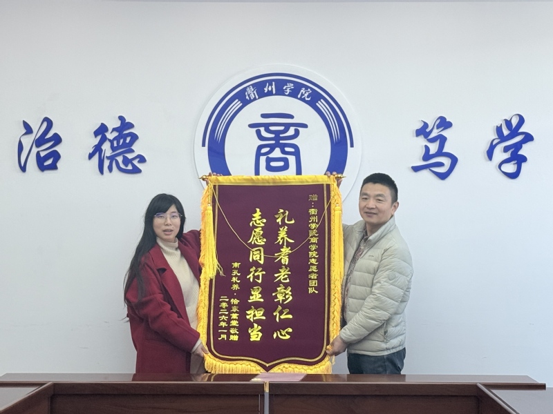 2026年1月15日,衢州南孔礼养养老服务管理有限公司副总经理张荣华一行来我院赠送锦旗,向商学院“心风尚”志愿者团支部长期以来的敬老志愿服务表达诚挚谢意。商学院党委副书记徐慧敏与学工办相关辅导员代表学院接受锦旗。随后,双方开展座谈交流。
